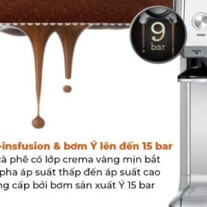 - Chức năng Pre Infusion: Sử dụng áp lực hơi nước thấp để nhẹ nhàng làm cafe nở ra khi bắt đầu quá trình pha chế