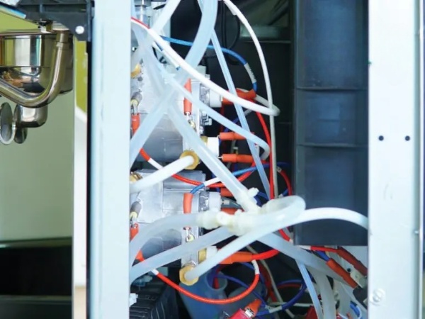 (Các máy pha cùng phân khúc 3085 hiện nay nồi hơi dung tích chỉ 500ml, đặt theo phương nằm ngang nên cần thêm một đoạn dây nối ra grouphead.)