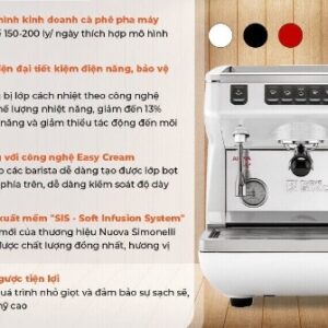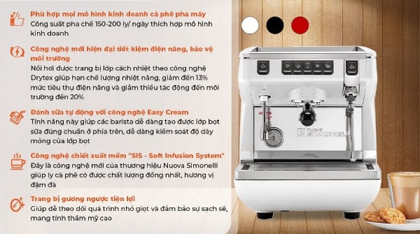 Công suất máy pha cà phê Simonelli có thể đạt được khoảng 150 đến 200 ly/ngày, phù hợp cho nhà hàng, khách sạn, quán cà phê. Sản phẩm có 3 màu đen, đỏ và trắng.